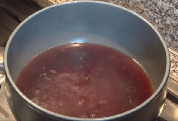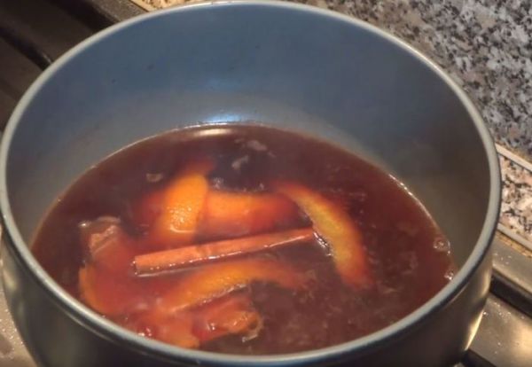 Приступаем к приготовлению клюквенного соуса. Добавляем в сотейник красное сухое вино - 300 грамм, 3 ст. ложки сахара. Помешиваем на медленном огне до растворения сахара. Добавляем цедру лимона и апельсина, а так же сок половины апельсина, немного лимонного сока 1 ст. ложка парку-тройку гвоздичек, чайную ложку мускатного молотого ореха и палочку корицы. Постоянно помешиваем.