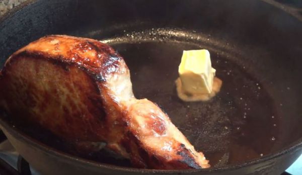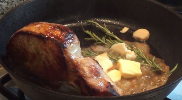 Масло подтаяло и впитало в себя ароматы розмарина и чеснока, сковородка на медленном огне. Я наклоняю сковороду и ложкой постепенно поливаю мясо этим ароматным маслом, тем самым постепенно доводя его до полной готовности. Сначала с одной стороны, потом с другой. На это уходит около 4-6 минут. Трудно озвучить конкретные цифры или время. Можно ориентироваться по упругости мяса, готовый кусок должен пружинить и не быть мягким. По готовности я заворачиваю мясо в фольгу, чтобы оно "отдохнуло", предварительно поперчив свежемолотым перцем.
