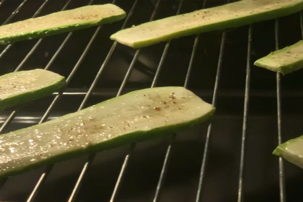 Кабачок разрезать на пластины, смазать маслом, посолить и поперчить и обжарить на гриле 5-6 минут