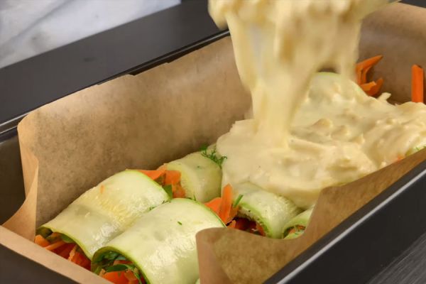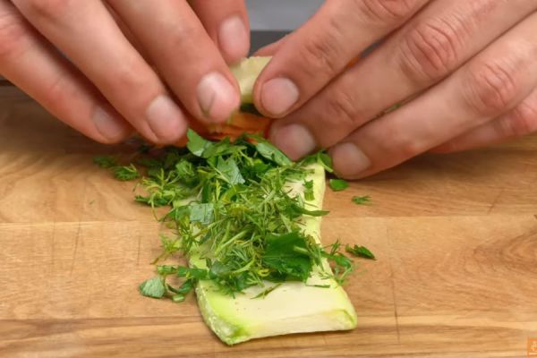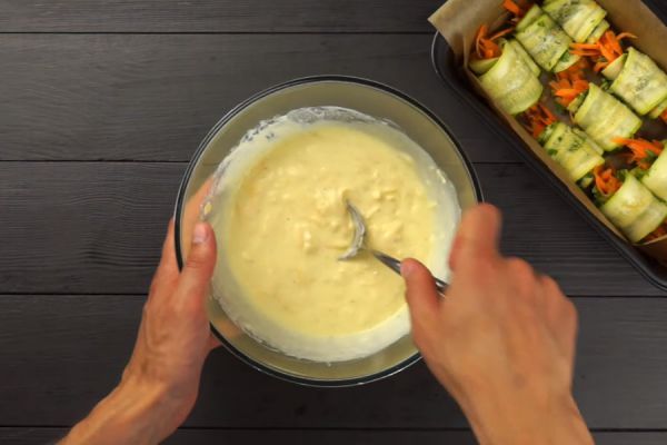 Морковь натереть на крупной терке или нарезать с помощью резки для корейской моркови. Зелень измельчить. Свернуть 9 рулетиков из кабачка с зеленью и морковью и уложить в форму для запекания.