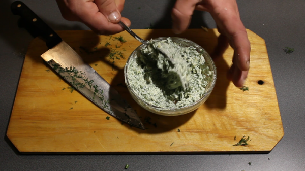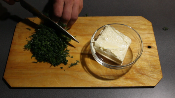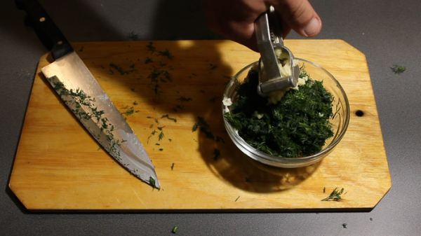 Дальше нужно взять укроп и измельчить, я взял пачку, по грамовке не скажу, но тут я с его количеством переборщил, одну треть точно следовало оставить до лучших времён. Накрошенный укроп добавляем к маслу.