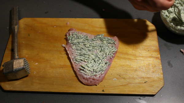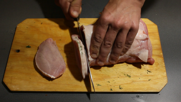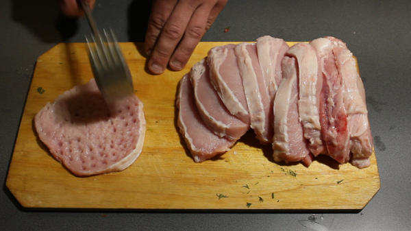 С подготовительной частью закончили, осталось разобраться с мясом. Его нарезаем кусками примерно толщиной около сантиметра. И отбиваем его до той поры, пока толщина мяса не уменьшится два раза или даже чуть больше.