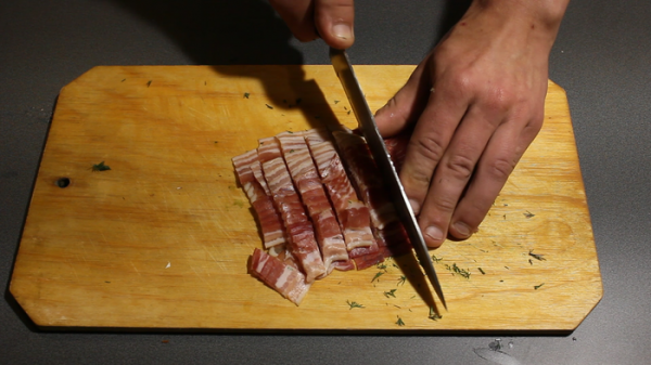 Переходим к самой вкусной части готовки, конечно же к нарезке бекона, бекон нарезаем небольшими кусочками, но никак не в труху. Дабы удешевить данный рецепт, можно использовать вместо бекона, цена на который кусается, мелко, ОЧЕНЬ МЕЛКО, нарезанное сало или ешё что-нибудь, пишите свои варианты в комменты.