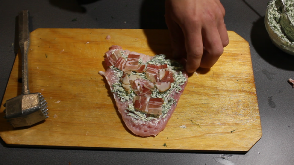 А теперь соединяем мясо с начинкой. Отбитый кусок мяса смазываем замешанным маслом тонким слоем, при жарке часть масла вытечет, но мясо успеет взять вкус и стать нежнее. Поверх масла выкладываем кусочки бекона, если бюджет позволяет, то берите на килограмм мяса – 250-300 грамм бекона, так будет просто БОГОПОДОБНО, но у меня бекона было изначально только грамм 80.
