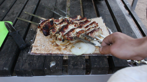 С собой на природу взял пачку лаваша и готовый шашлык выложил на него, чтобы он пропитался жирком и потом можно было их обжарить на углях, бонусная вкусняшка. И пока шашлык горячий, на него сверху стоит положить кольца лука, чтобы мясо получило немного дополнительного аромата от него.