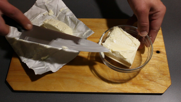 Для начала нужно взять грамм 150-180 сливочного масла, дорогое не берите, подойдёт самое простое. Предварительно его достаньте его из холодильника и пусть подтает, чтобы дальше можно было его замесить. Перекладываем в миску, где будем замешивать масло с другими ингредиентами.