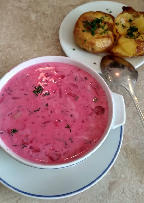 Окрошку, совсем недавно делали. А тут натолкнулся на рецепт холодного литовского супа (свекольника)- Šaltibarščiai. Этот свекольник обычно подают с горячей вареной картошкой и зеленью.