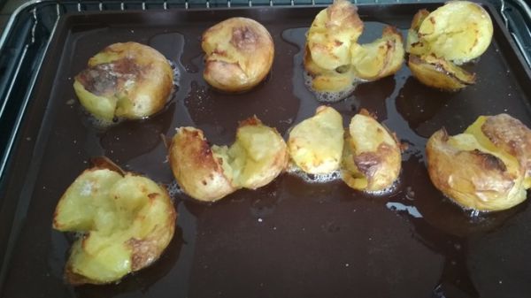Утром отварил картофель в мундире, после чего переложил еще горячий картофель на противень, сделал ложкой углубление (придавил) посыпал крупной солью и полил нерафинированный подсолнечным маслом. Поставил в горячую духовку на 190 градусов, под гриль. Как только зарумянилось - готово.