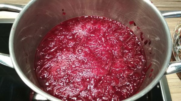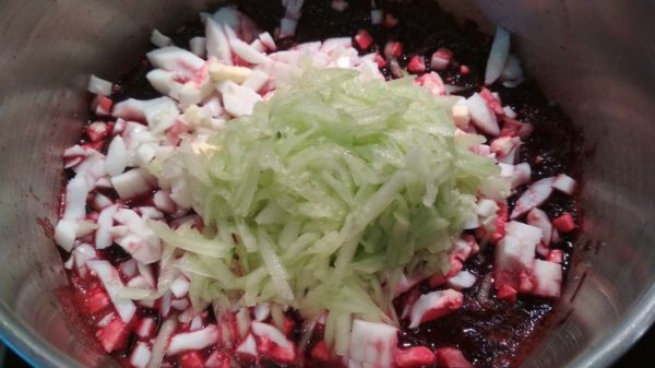 Если свекла маринованная, порежьте ее соломкой и, если любите поострее, добавьте в кастрюлю маринад от свеклы.