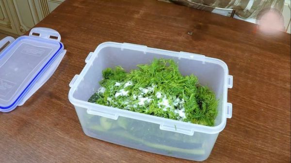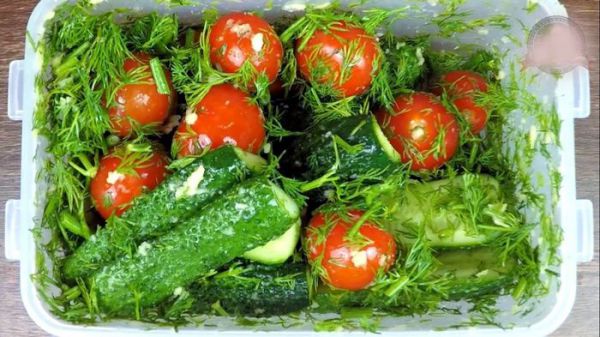 ПОШАГОВОЕ ПРИГОТОВЛЕНИЕ:Подготовить все ингредиенты. Есть как минимум 2 варианта приготовления этого салата- закуски.Первый вариант, когда все ингредиенты смешиваем в целлофановом пакете. Но мне ближе второй вариант, когда все помещается в большой пластиковый контейнер. Решать вам, какой из вариантов применить у себя на кухне.Приступим к приготовлению. Огурцы сейчас в сезон особенно вкусные и хрустящие. Мне больше нравится огурцы маленьких аккуратных размеров. Убираем у них попки и разрезаем пополам. Складываю в контейнер.Помидоры черри более плотные, поэтому беру именно их. Протыкаю вилкой в 2-х-3-х местах. Чеснок давлю через пресс. Можно так же воспользоваться мелкой теркой. Добавляю в контейнер.Свежий укроп нарезаю произвольно. Не очень мелко. Добавляю в контейнер. Солю огурцы. Закрываю контейнер крышкой и активно встряхиваю ингредиенты. Таким образом, огурцы друг об друга обобьются и пропитаются соком чеснока и укропа. 30 секунд активной тряски будет достаточно! Сюда же добавлю помидоры черри. Закрою контейнер и еще чуть потрясу. Оставить минимум на 2-3 часа овощи. Периодически встряхивать за все время 3-4 раза по 5-10 секунд. Помидорам, конечно же, нужно больше времени для маринования. Я обычно делаю с вечера такой салат-закуску и отправляю в холодильник. Такие овощи идеально подходят к любому мясу. В сезон перца добавляю и его. Рецепт проверенный. Подготовка займет считанные минуты. Всего 5-10 минут вашего драгоценного времени и у вас на столе настоящая вкуснятина! Попробуйте обязательно приготовить такие малосольные овощи. Надеюсь, рецепт был полезен. Приятного Вам аппетита.