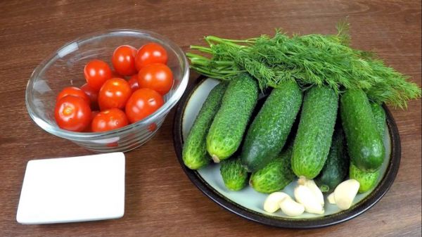 Ингредиенты:Огурцы маленькие – 500 гр.Помидоры черри – 250 гр.Укроп -30 гр.Чеснок – 3-5 зубчиковСоль – 1 ч.л.