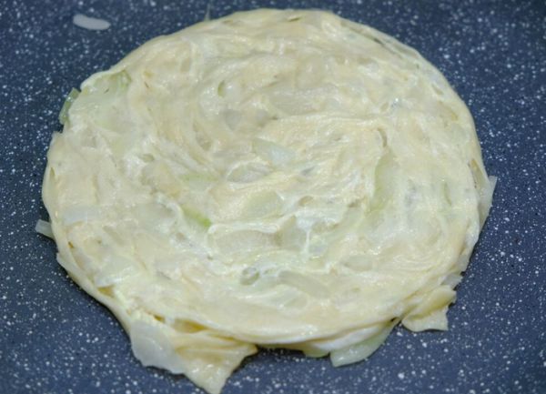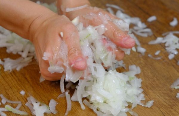 Лук нарезать очень тонко, посолить и немного помять, оставить, чтобы из него выделился сок. Сок удалить, чтобы от него не размокало тесто.