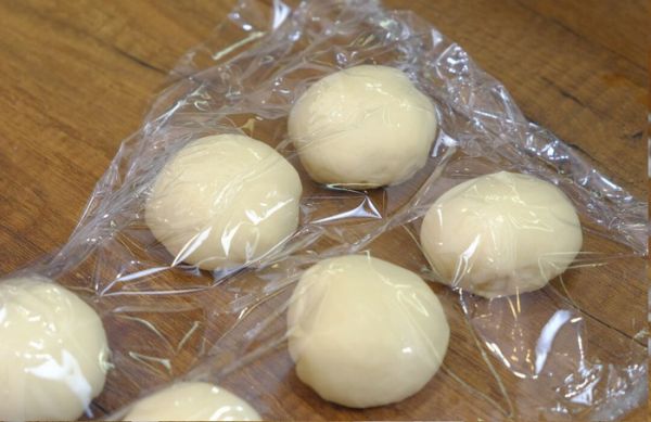 Тесто разделить на 8 частей. Каждую часть округлить и положить под пленку, чтобы тесто не заветривалось.