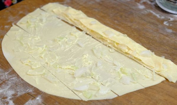 Каждую лепешку раскатать очень тонко, подсыпая муку по необходимости. Сверху смазать тесто мягким сливочным маслом, выложить лук.