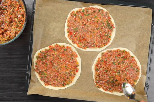 Выпекайте лахмаджун в разогретой до 230°C духовке в течении 10 минут. Накройте лепешки полотенцем или миской, чтобы они немного пропарились и были мягкими. Есть их можно просто свернув в трубочку, но вкуснее положить начинку в виде нарезанных свежих овощей.