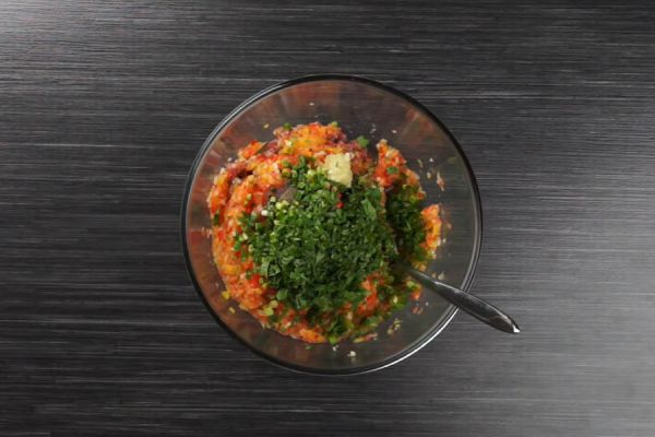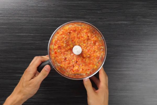 Для начинки в чашу блендера сложите нарезанные помидоры, лук, перцы (желтый, красный, острый) и измельчите их так, чтобы получилось не пюре, а очень мелкая крошка.