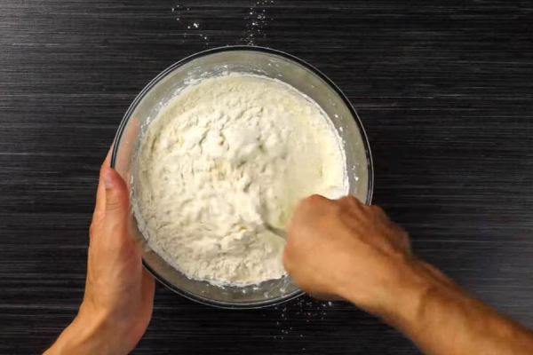 Начнем с теста. Для этого в миске смешаем яйцо с сахаром и творогом, добавим муку с разрыхлителем и замесим тесто.