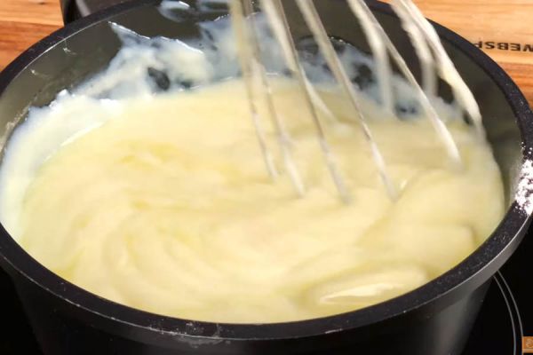 Приготовим крем. Для этого в сотейник добавим сахар, муку и яйцо, хорошо перемешаем. Далее добавим молоко, еще раз перемешаем и отправляем на слабый огонь. Там варим крем постоянно помешивая до загустения.