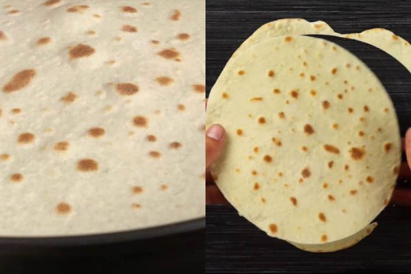 Обжарим лепешки на сковороде по 2-3 минуты с каждой стороны и обрежем, приложив тарелку диаметром 18 см. Обрезки не съедать, они еще нужны для посыпки :)