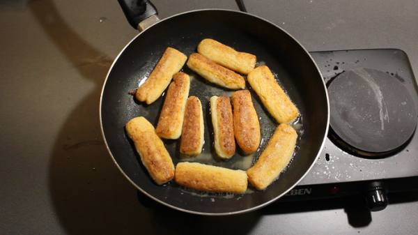 На сковороду наливаем подсолнечное масло, разогреваем его хорошо и помещаем в него брусочки. Обжариваем с каждой стороны по пять минут, до золотистой корочки. Обязательно на среднем огне. Можно посыпать сахарной пудрой. Они очень мягкие и воздушные, а на следующий день не черствеют.