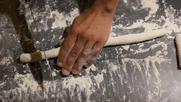 Для удобства, полученное тесто делим на части и раскатываем каждую из них в жгутики диаметром около сантиметра. А после разрезаем на части по 7-10 сантиметров