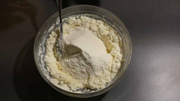 200-300 грамм муки с разрыхлителем. Муку добавляем постепенно, тесто должно оставаться немного липким, но держать форму. Как только тесто начинает держать форму, месим его на столе.