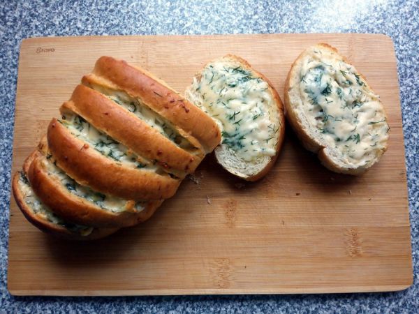 2. Сделать надрезы по всей длине батона не доходя до конца примерно на 1 см.