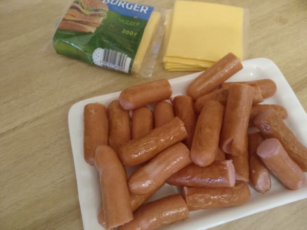 Слайсы сыра делим на 2 части. В каждую сосиску вставляем шпажку и еще теплыми обматываем сыром.