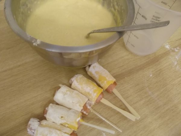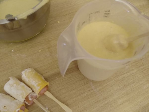 Переливаем тесто в такую емкость, в которую будет удобно окунать сосиски.