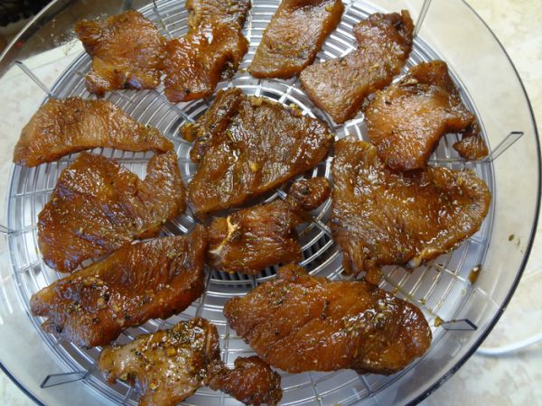 Тщательно взбалтываем. Теперь опускаем туда мясо и массируем руками, чтобы всё хорошенько впиталось, после чего убираем в холодильник на 1 час мариноваться. Через час вынимаем мясо, и выкладываем его на сушилку для овощей. В сушилке включаем режим обдува и нагрев. У всех сушилки разные, но думаю нагревают в диапазоне от 55-60 градусов. Я Оставил в таком состоянии примерно на 9-10 часов.
