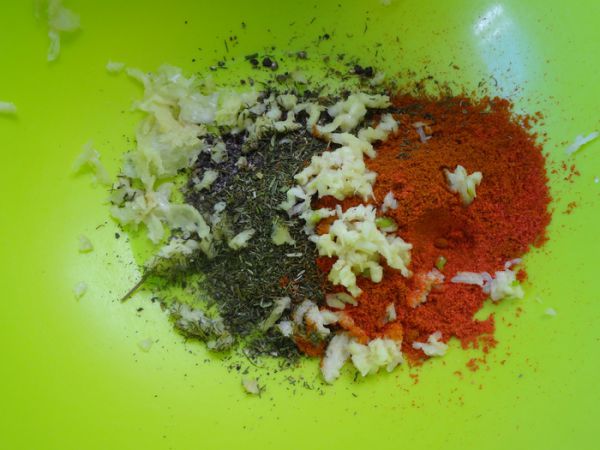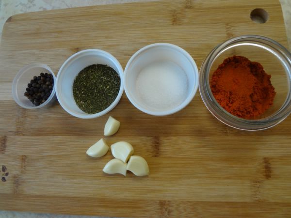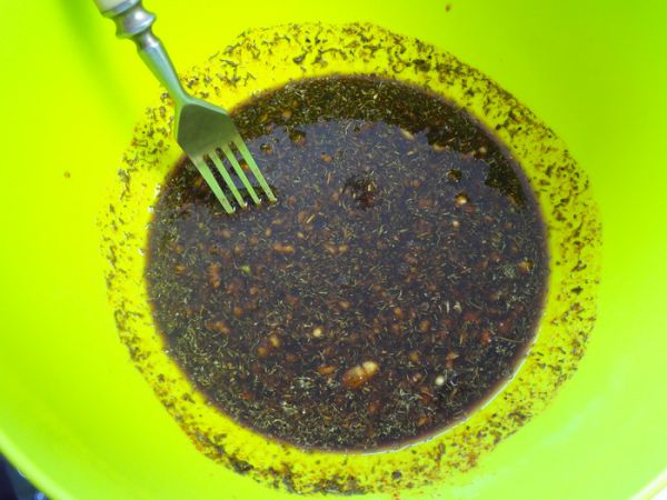 Смешиваем специи с соевым соусом. А вот нитритную соль я посыпал на кусочки мяса заранее, чтобы она успела впитаться (за 15 минут до этого). Опасался того, что нитритная соль потеряется в соевом соусе и в полной мере не попадёт на мясо.