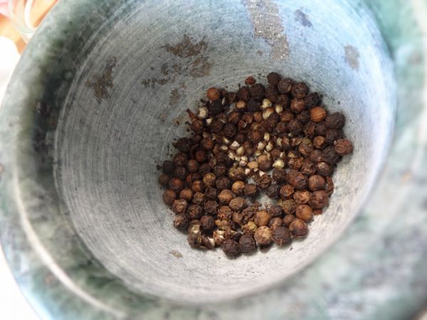 Если кусочек слишком длинный - можно разрезать пополам, вы должны понимать, что куски по готовности станут в 2 раза меньше. Измельчаем горошек перца перед смешиванием, так мы получим наиболее свежий аромат эфирных масел и сохраним все полезные свойства.
