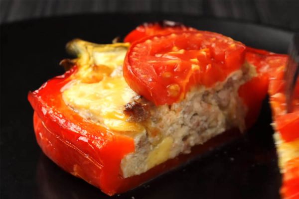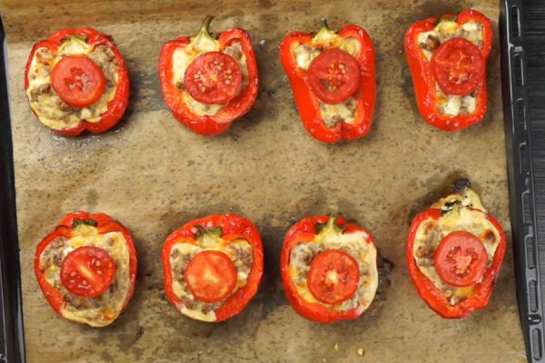 На каждый перец уложите по одной дольке помидора и запекайте еще 5 минут.