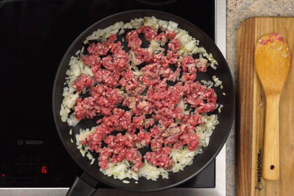 Начните с обжарки фарша и лука. Лук пассеруйте 5 минут а потом добавьте фарш и обжарьте 7-10 минут.