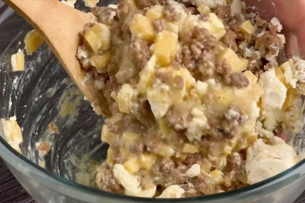 Фарш пересыпьте в миску, добавьте 3 яйца, мелкие кубики сыра и перетертую Фету, посолите, поперчите и хорошо перемешайте.