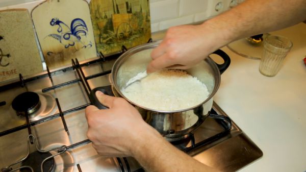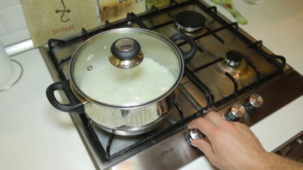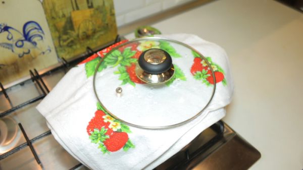К этому времени рис уже должен был свариться. Выключаем газ, переставляем кастрюлю на холодную конфорку. Открываем её и накрываем полотенцем, чтобы оно впитало лишнюю влагу. Сверху кладём крышку и оставляем рис доходить ещё на 15 минут.