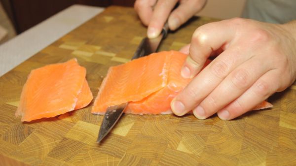 Достаём подмороженную сёмгу из морозилки. Нарезаем её пластинами по 3-4 мм.
