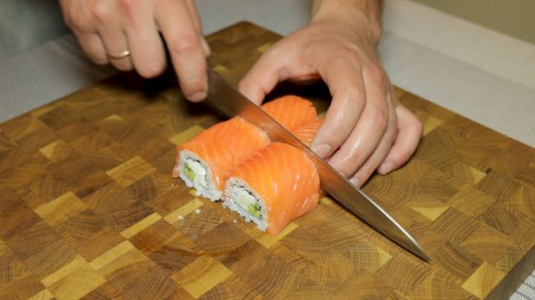 Следом за сыром выкладываем авокадо и огурец. Придерживая начинку сворачиваем ролл. Разворачиваем циновку, смещаем ролл и подбиваем у него торцы так же как делали с роллом калифорния. Выкладываем на ролл кусочки сёмги так, чтобы между ними не было видно риса. Я рекомендую располагать их с небольшим нахлестом. Это положительно скажется на внешнем виде ролла. Ещё раз заворачиваем ролл в циновку, как следует прижимая рыбу к рису. Разрезаем ролл на 8 частей.
