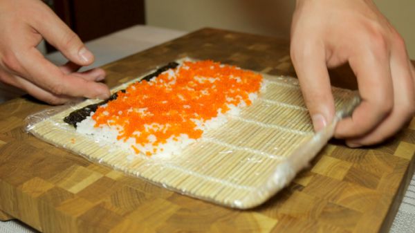 Первым сегодня мы будем готовить ролл калифорния. Кладём на циновку полоску нори. Смоченными руками выкладываем рис смещая его на 1см. вверх. Я имею в виду, что внизу у нас остается полоска нории без риса, а вверху получится полоска риса без нории. Наносим на рис икру летучей рыбы тобико. Накрываем рис свободной половинкой циновки и немного прижимаем, чтобы икра прилипла к рису.