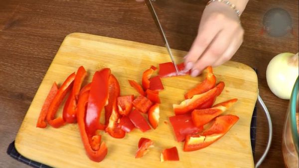 Болгарский сладкий перец помыть и удалить семена. Нарезать полосками, затем на кубики.
