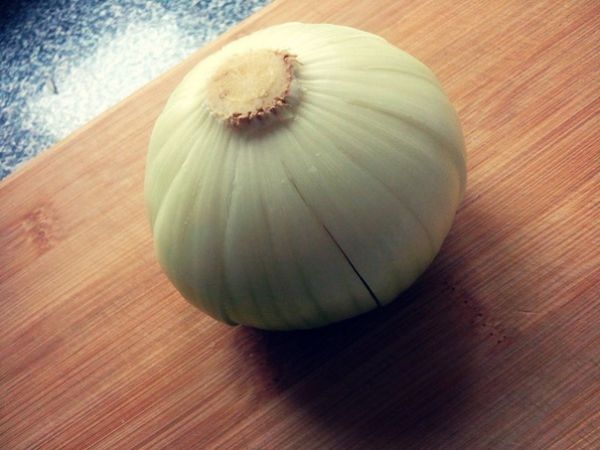 У очищенной луковицы срезать верхушку и перевернуть - корневую основу аккуратно подрезать или не трогать вообще, иначе все развалится. Сделать 10-16 надрезов, не доходя до корня примерно на 1 см.