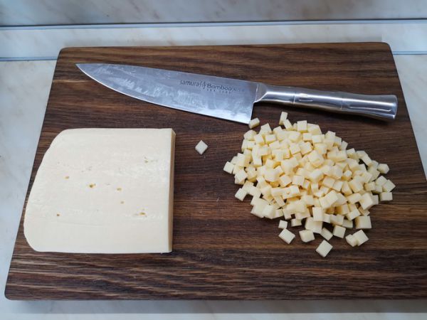 Далее, нарезаем сыр мелким кубиком примерно 5х5мм