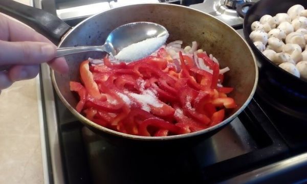 Перец в конечном итоге должен остаться слегка хрустящим плотным внутри (не прожаривайте его до мягкости иначе всё превратится в кашу - перец должен остаться полосками, как мы его и нарезали)