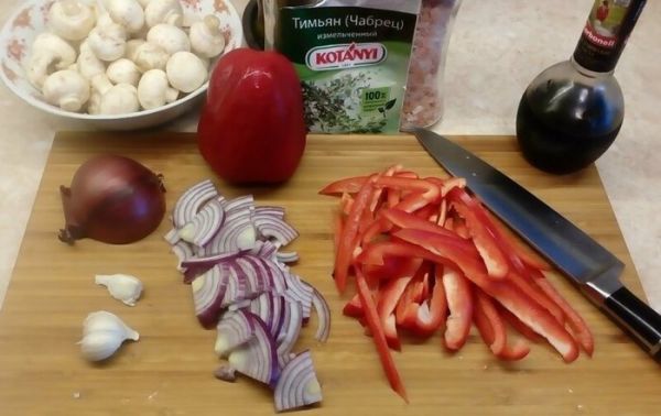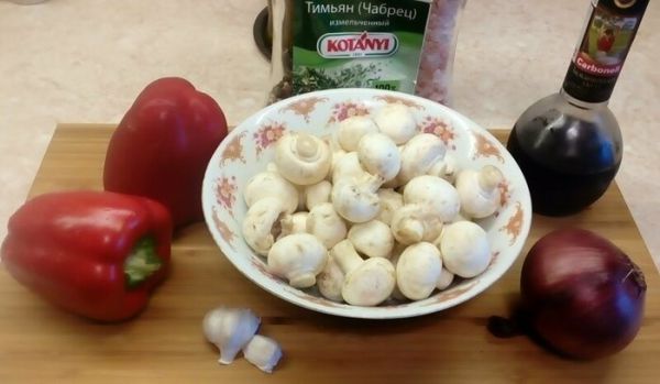 Закуска из шампиньонов маринованных с бальзамическим уксусом, чесноком и кисло-сладким болгарским перцем.
