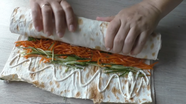Заворачиваем плотный рулет и сразу можно нарезать.