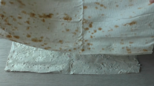 Один лаваш смажем соусом и аккуратно накроем вторым, что бы края совместились.