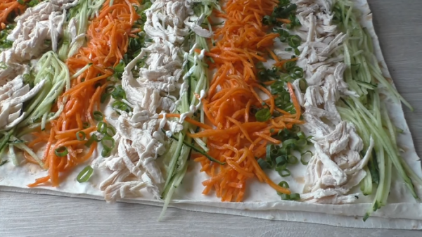 Рядами (слоями) выкладываем подготовленную начинку. Огурцы (натереть на корейской терке), следом курица (разберите мясо на волокна), мелко порезанный лук и последний слой морковь по-корейски. Все повторяем, после чего можно добавить немного майонеза (сеточка) между слоями огурцов и курицы.