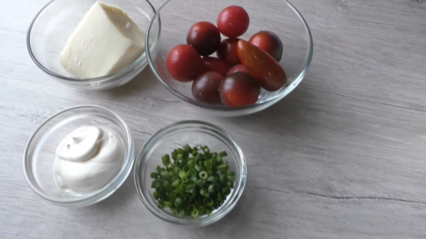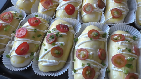 Даем нашим булочкам хорошо расстояться (в духовке со включенной лампочкой и чашкой кипятка), минут 20-30. После чего смажем желтком, сделаем сеточку из майонеза, сверху порезанные кружочки черри и зеленый лук. Духовка разогрета, остается посыпать остатками сыра и в печь.