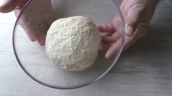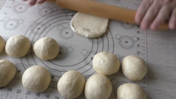Готовое тесто делим на 12 равных частей, округляем и даем постоять под пленкой на столе (пусть отдохнут минут 10). После чего раскатываем в небольшую лепешку.
