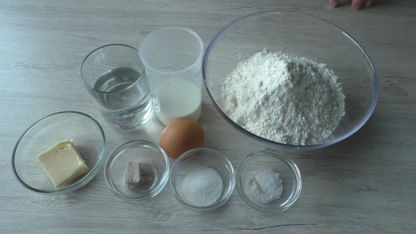 Для теста будем использовать кусочек прессованных дрожжей (можно заменить на неполную чайную ложку сухих) и равное количество молока и воды.